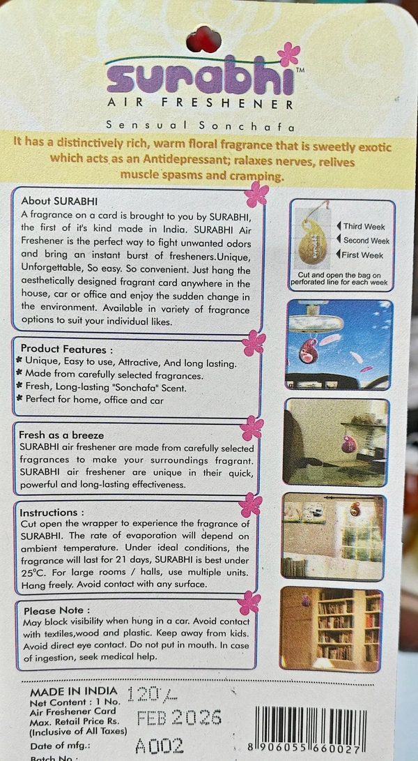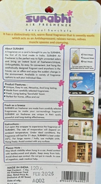 Don't wait to elevate your surroundings with the Surbhi Air Freshener (Sensual Sonchafa). Experience the difference that long-lasting, luxurious fragrance can make in your life. Order now and enjoy a fresher, more inviting home, car, or office space!